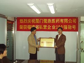 由福建省私營企業(yè)協(xié)會、福建日報社聯(lián)合開展的2005年度“福建省私營企業(yè)100強”評定活動,于近日揭曉最終入圍企業(yè),廈門鷺燕醫(yī)藥有限公司榜上有名。今天,市工商局的領導來我司進行了授牌儀式。儀式上,吳金祥總裁向領導們介紹了鷺燕的成長歷程,并對將來的經(jīng)營進行了展望。領導們在聽取了吳總裁的匯報后,肯定了鷺燕的發(fā)展模式,同時,也對鷺燕的可持續(xù)發(fā)展提出了許多有益的建議。