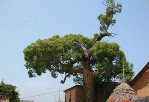 (藍天,白云,古樹,房屋一幅和諧美麗的“圖畫”)
